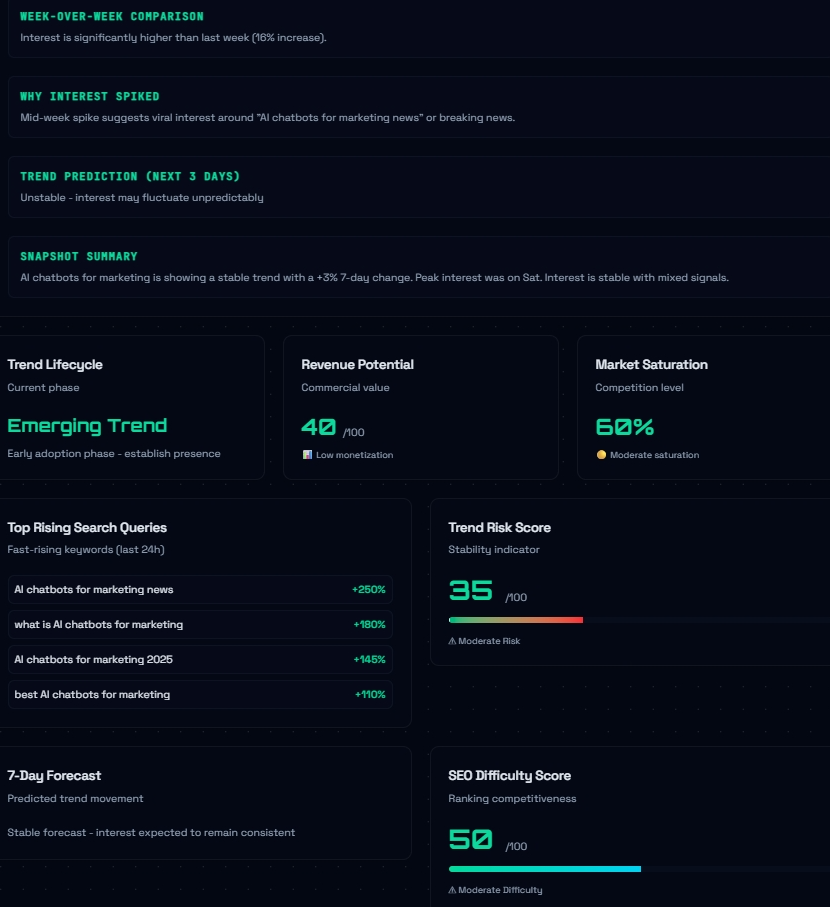 Consider a creator chasing “AI avatar generators” in early 2024. Traditional tools showed no volume growth until months later — by then major publishers had captured featured snippets and rankings. Early creators could have dominated traffic with near-zero competition if they’d had access to real-time signals instead.