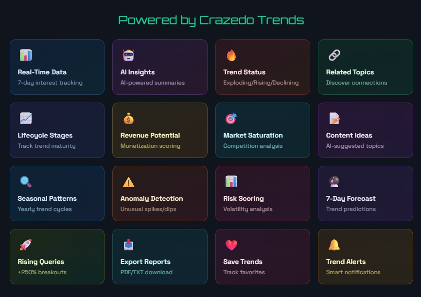 This approach hides what truly matters: momentum. By the time most SEO tools update their databases or show consistency signals, ranking opportunities are already lost, competitors are indexed, and the SERPs become crowded. This is exactly where Crazedo AI v2.0 changes the game. Built as a real-time Google Trends intelligence platform, Crazedo doesn’t just display trending searches — it analyzes emerging SEO trends and rising keywords as they begin gaining traction, enabling businesses, bloggers, journalists, creators, and agencies to deploy content assets while competition is still weak.